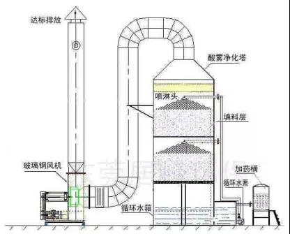 設(shè)備本身包有本體、填充層、除霧層、循環(huán)灑水管路,及循環(huán)水槽等。